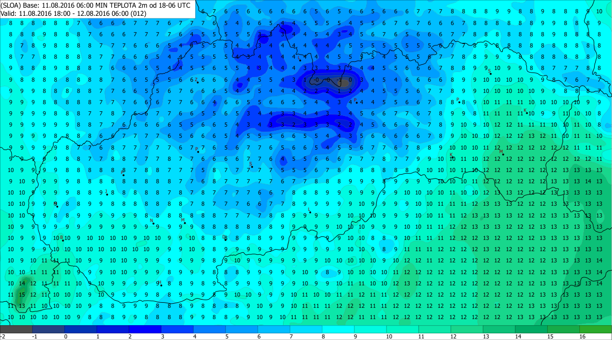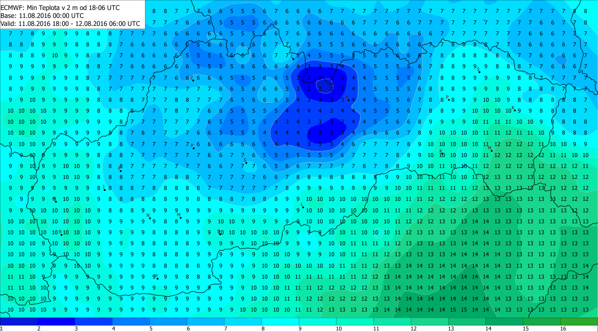 Najchladnejší vzduch sa k nám však dostane až v noci na 12.8. (obr. 5 teplota v hladine 850 hPa na severe 3-4 °C). Súčasne k nám bude zasahovať od západu výbežok vyššieho tlaku vzduchu, no len v slabom tlakovom gradiente, čo spôsobí zoslabnutie vetra. Tiež sa k nám dostane suchší vzduch. Nastanú tak ideálne podmienky na výrazné nočné ochladzovanie (predpoveď minimálnej teploty vzduchu v 2 m modelu ALADIN a ECMWF), v dolinách sa bude teplota ojedinele približovať k nule, pričom taktiež sa môže vyskytnúť aj prízemný mráz.