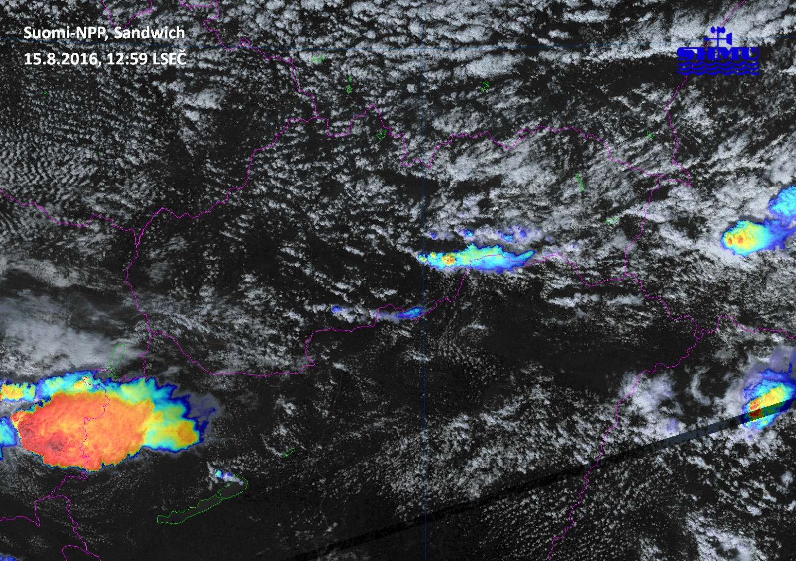 Obr. 3 - Snímka z družice Suomi-NPP, produkt Sandwich - kombinácia produktov viditeľného a infračerveného kanálu s farebne znázorneným poľom jasovej teploty hornej hranice oblačnosti, 15.8.2016, 14:40 LSEČ (je použitá iná farebná škála ako pri obr. 2).