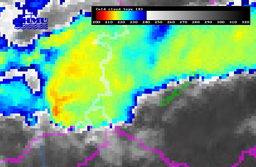 Snímky vo vysokom rozlíšení z preletu B sú na obr. 1-3. Snímka na obr. 1 je RGB kompozit viditeľného a infračerveného kanálu. Detailne vidieť kopovitú oblačnosť - žltou je plytká kopovitá oblačnosť, bielo-modrá s výraznými štruktúrami je mohutná oblačnosť (siaha až po tropopauzu). Z tejto mohutnej oblačnosti je silným západným výškovým prúdením unášaný ľadový materiál ďalej na východ, na obr. 1 je to vysoká modrastá oblačnosť s jemnou štruktúrou najmä na východných okrajoch oblačného komplexu. Najstudenšie oblasti sú modré, najmä prestreľujúce vrcholky. Tento produkt však nie je úplne vhodný na analýzu jasovej teploty hornej hranice oblačnosti. Lepšie je využiť IR kanál so zvýraznenou škálou poľa jasovej teploty, ktoré je na obr. 2. Tu už detailne vidieť typické štruktúry: