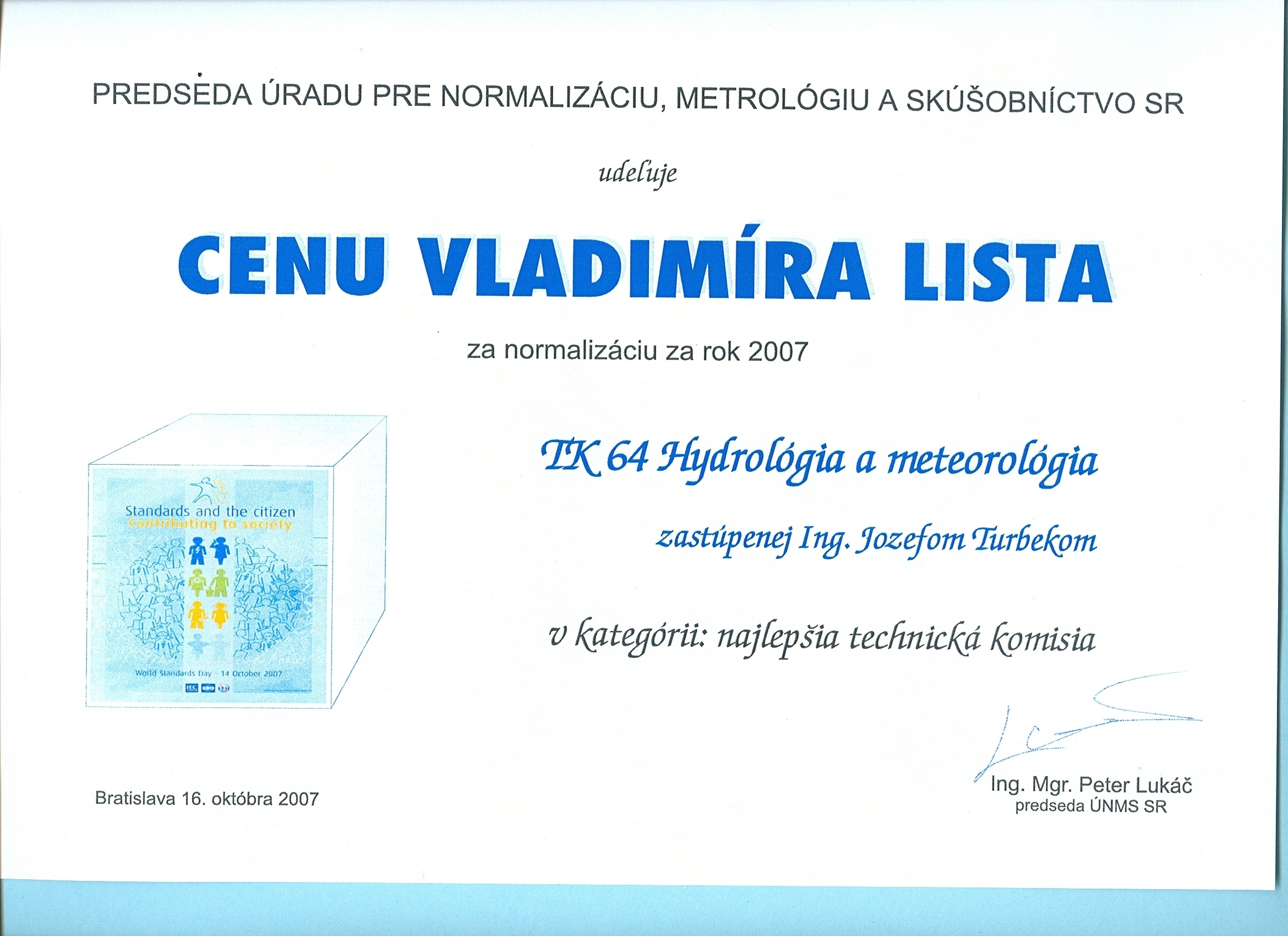 Pri príležitosti Svetového dňa normalizácie bola 16. októbra 2007 v kategórii najlepšia technická komisia udelená Cena Vladimíra Lista za normalizáciu Technickej komisii TK 64 - Hydrológia a meteorológia. Cenu z rúk predsedu ÚNMS SR Ing. Mgr. P. Lukáča prevzal zakladajúci predseda TK 64 Ing. J. Turbek.