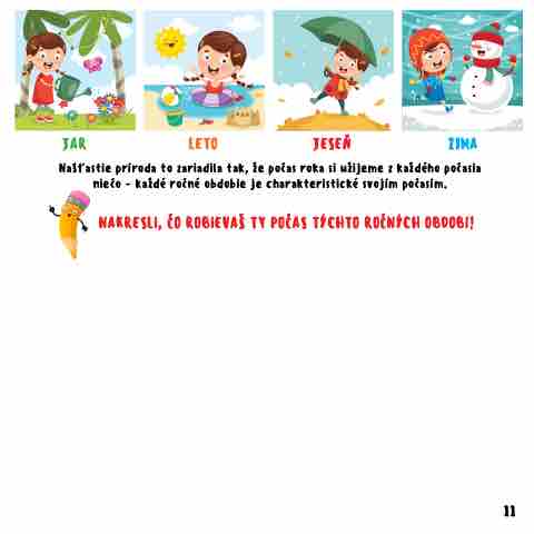 JAR LETO JESEŇ ZIMA Našťastie príroda to zariadila tak, že počas roka si užijeme z každého počasia niečo - každé ročné obdobie je charakteristické svojím počasím. NAKRESLi, ČO ROBiEVAŠ TY POČAS TÝCHTO ROČNÝCH OBDOBí! 11