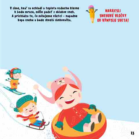V zime, keď' sa ochladí a teplota vzduchu klesne k bodu mrazu, môže padať z oblakov sneh. A prichádza to, čo milujeme všetci - napadne kopa snehu a bude skvelá sánkovačka. NAKRESLi SNEHOVÉ VLOČKY OD VÝMYSLU SVETA! 13