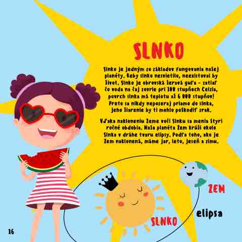 Slnko je jedným zo základov fungovania našej planéty. Keby slnko nesvietilo, neexistoval by život. Slnko je obrovská žeravá guľa - zatiaľ čo voda na čaj zovrie pri 100 stupňoch Celzia, povrch slnka má teplotu až 6 000 stupňov! Preto sa nikdy nepozeraj priamo do slnka, jeho žiarenie by ti mohlo poškodiť zrak.