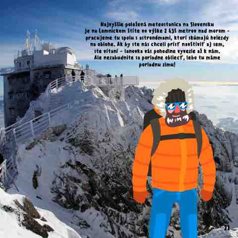 na oblohe. Ak by ste nás chceli prísť navštíviť aj sem, ste vítaní - lanovka vás pohodlne vyvezie až k nám. Ale nezabudnite sa poriadne obliecť, lebo tu máme poriadnu zimu!