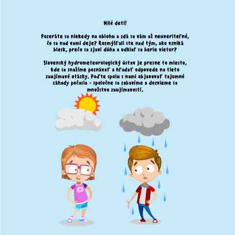 Slovenský hydrometeorologický ústav je presne to miesto, kde sa snažíme poznávať a hľadať odpovede na tieto zaujímavé otázky. Poď'te spolu s nami objavovať tajomné záhady počasia - spoločne sa zabavíme a dozvieme sa množstvo zaujímavostí.