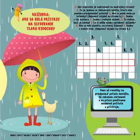 1. Aké zvieratko je nakreslené na vedľajšej strane? 2. Čo je jednou zo základných veličín, ktorá nám pomáha predpovedať počasie? 3. Ako sa povie voda po latinsky? (Odpoveď' nájdeš na strane 4.) 4. Jedna