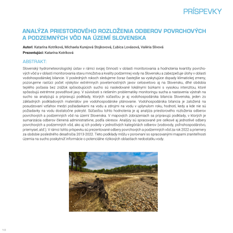 Slovenský hydrometeorologický ústav v rámci svojej činnosti v oblasti monitorovania a hodnotenia kvantity povrcho- vých vôd a v oblasti monitorovania stavu množstva a kvality podzemnej vody na Slovensku a zabezpečuje úlohy v oblasti vodohospodárskej bilancie. V posledných rokoch sledujeme čoraz častejšie sa vyskytujúce dopady klimatickej zmeny, pozorujeme rastúci počet výskytov extrémnych poveternostných javov celosvetovo aj na Slovensku, dlhé obdobia teplého počasia bez zrážok spôsobujúcich sucho sú nasledované lokálnymi búrkami s vysokou intenzitou, ktoré spôsobujú extrémne povodňové javy. V súvislosti s riešením problematiky monitoringu sucha a nastavenia výstrah na sucho sa analyzujú a pripravujú podklady, ktorých súčasťou je aj vodohospodárska bilancia Slovenska, jeden zo základných podkladových materiálov pre vodohospodárske plánovanie. Vodohospodárska bilancia je založená na posudzovaní vzťahov medzi požiadavkami na vodu a zdrojmi na vodu v uplynulom roku, hodnotí, kedy a kde nie sú požiadavky na vodu dostatočne pokryté. Súčasťou tohto hodnotenia je aj analýza priestorového rozloženia odberov povrchových a podzemných vôd na území Slovenska. V mapových zobrazeniach sa pripravujú podklady, v ktorých je sumarizácia odberov členená administratívne, podľa okresov. Analýzy sú spracované pre celkové aj jednotlivé odbery povrchových a podzemných vôd, ako aj ich podiely v jednotlivých kategóriách odberov (vodovody, poľnohospodárstvo, priemysel, atď.). V rámci tohto príspevku sú prezentované odbery povrchových a podzemných vôd za rok 2022 a priemery za obdobie posledného desaťročia 2013-2022. Tieto podklady môžu v porovnaní so spracovanými mapami zraniteľnosti územia na sucho poskytnúť informácie o potenciálne rizikových oblastiach nedostatku vody.
