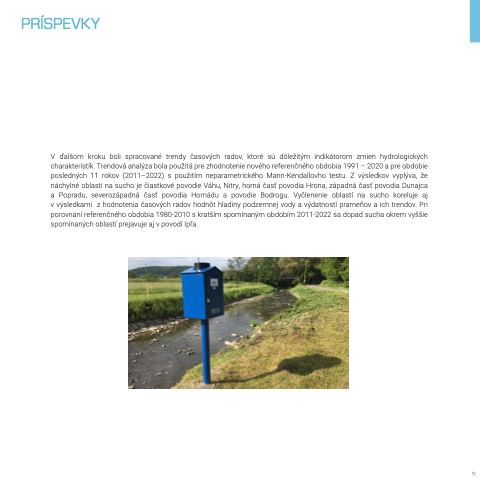 V ďalšom kroku boli spracované trendy časových radov, ktoré sú dôležitým indikátorom zmien hydrologických charakteristík. Trendová analýza bola použitá pre zhodnotenie nového referenčného obdobia 1991 – 2020 a pre obdobie posledných 11 rokov (2011–2022) s použitím neparametrického Mann-Kendallovho testu. Z výsledkov vyplýva, že náchylné oblasti na sucho je čiastkové povodie Váhu, Nitry, horná časť povodia Hrona, západná časť povodia Dunajca a Popradu, severozápadná časť povodia Hornádu a povodie Bodrogu. Vyčlenenie oblastí na sucho koreluje aj v výsledkami z hodnotenia časových radov hodnôt hladiny podzemnej vody a výdatností prameňov a ich trendov. Pri porovnaní referenčného obdobia 1980-2010 s kratším spomínaným obdobím 2011-2022 sa dopad sucha okrem vyššie spomínaných oblastí prejavuje aj v povodí Ipľa.